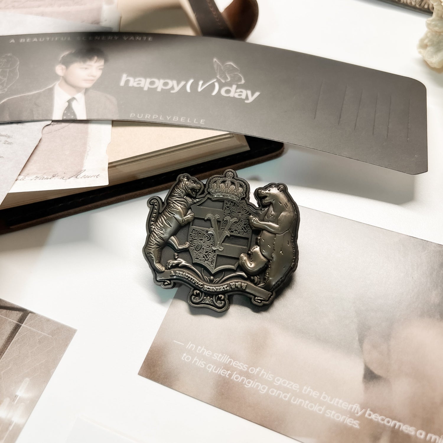 This pin holds a unique story, born from the creative collaboration between myself and Didi (ig _temptaetions_) during my 2nd ‘A Beautiful Scenery, Vante’ Event. We poured our hearts into designing a crest that captures Taehyung’s essence, navigating through countless ideas, trials, and revisions.